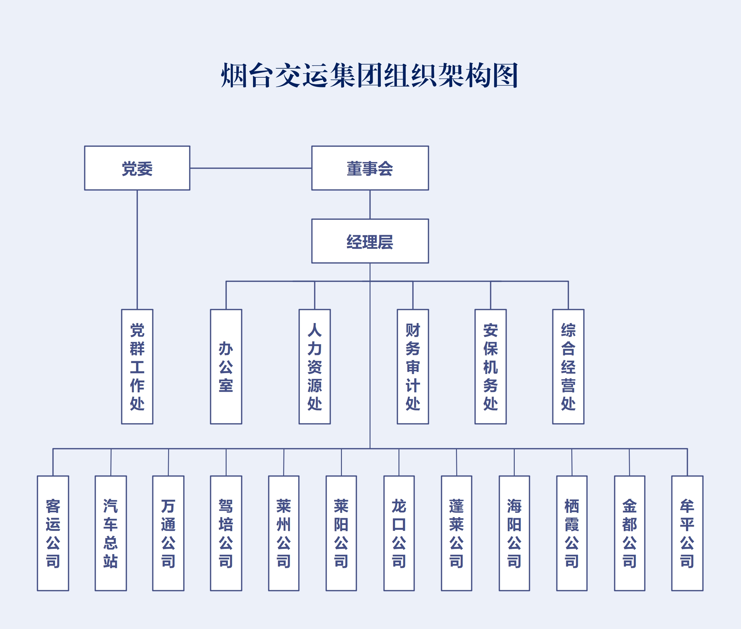 煙臺交運集團組織結構模式是以直線職能制為主的經營管理組織結構。集團總部設